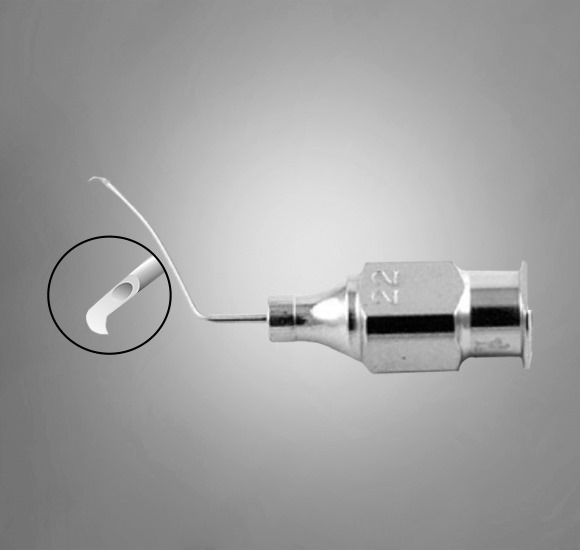 Aiguille physiquement pliée pour se conformer à la convexité du cristallin pour accéder à la cataracte.